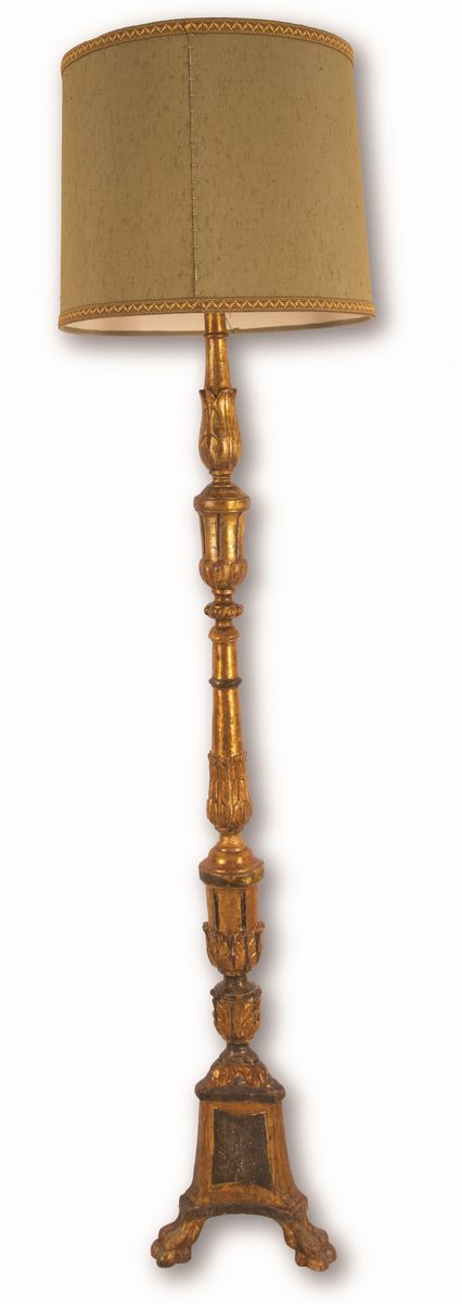 Grande torciere in legno intagliato in argento dorato a mecca. Piedi ferini.