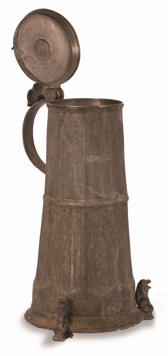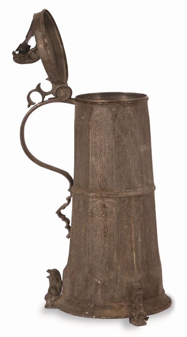 Tankard in peltro. Stemma in alto con la scritta Jacob Koch 1570