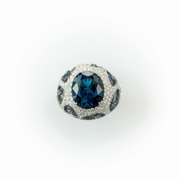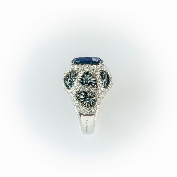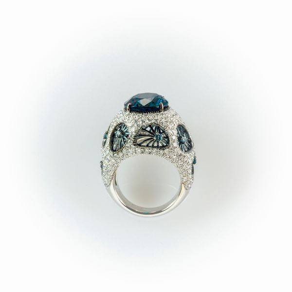 Anello a fascia Salvini in oro bianco con particolare manifattura costituita da un topazio London Blu centrale ed elementi forati sulla superficie [..]