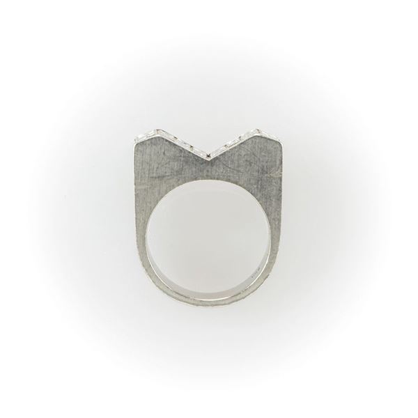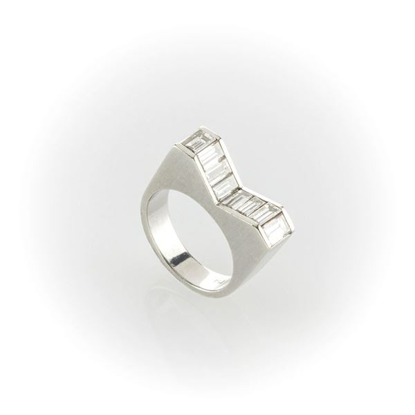 Anello in oro bianco di manifattura artigianale con diamanti taglio baguette