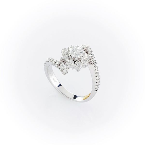 Patterned ring with a central diamond surrounded by brilliant cut diamonds. Ring opposing with brilliant cut white diamond pavè.