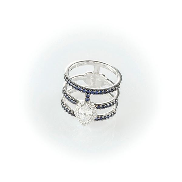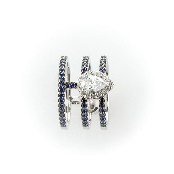 Recarlo Band Ring in white gold with white diamond central teardrop cut surrounded by pavè of blue round cut sapphires