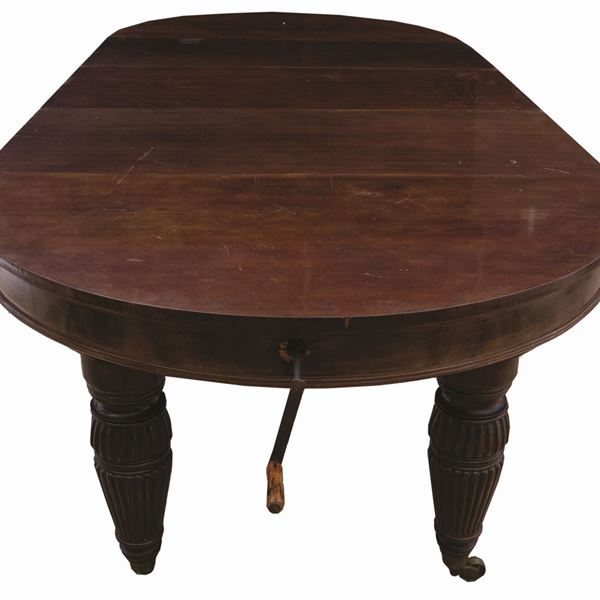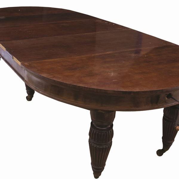 Grande tavolo tondo allungabile in mogano. Inghilterra, epoca Vittoriana.