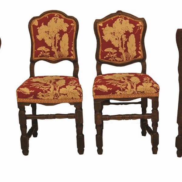 Lotto di 4 sedie a rocchetto in noce. Seduta e schienale con tappezzeria rossa a motivi vegetali