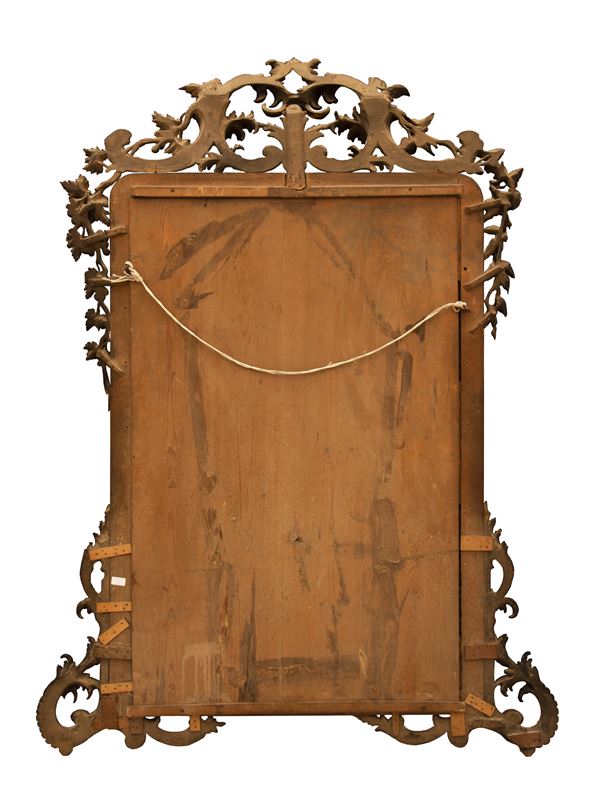 Specchiera intagliata in legno dorato e laccato verde scuro.