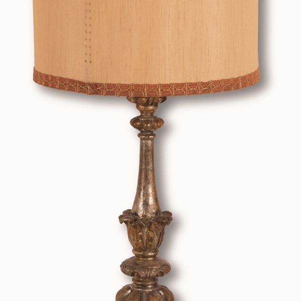 Candeliere in legno intagliato ed argentato a mecca su una faccia delle tre. Piedi ferini.