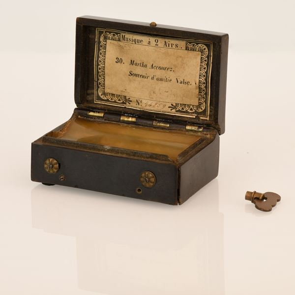 Carillon tabacchiera in corno che presenta incisa sul coperchio una piazza parigina. Francia, 1830.