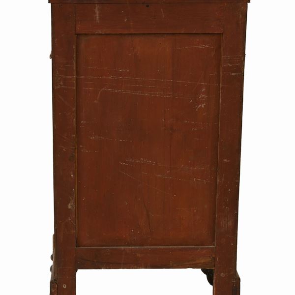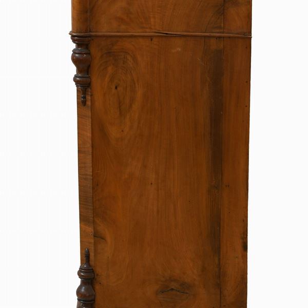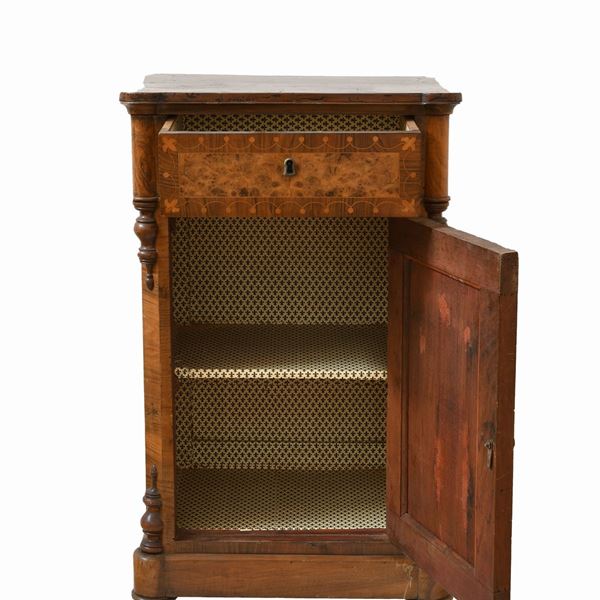 Comodino Luigi Filippo in noce e radica sul fronte. Intarsiato in acero.