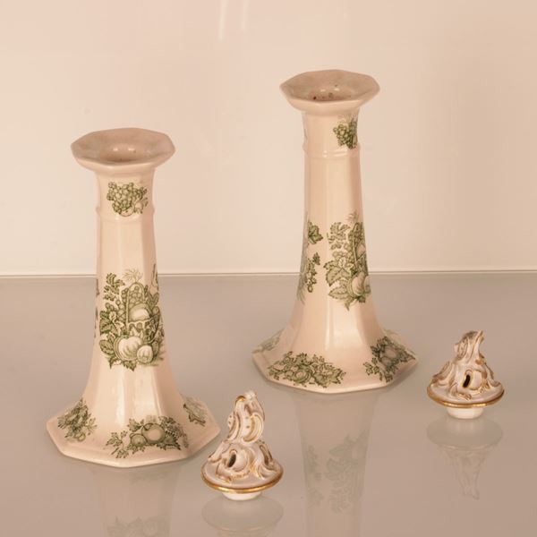 Coppia di portacandele Masons in porcellana con decoro a racemi verde su fondo bianco. e tappi decorativi a forma di fiamma lumeggiati d'oro [..]