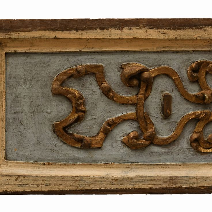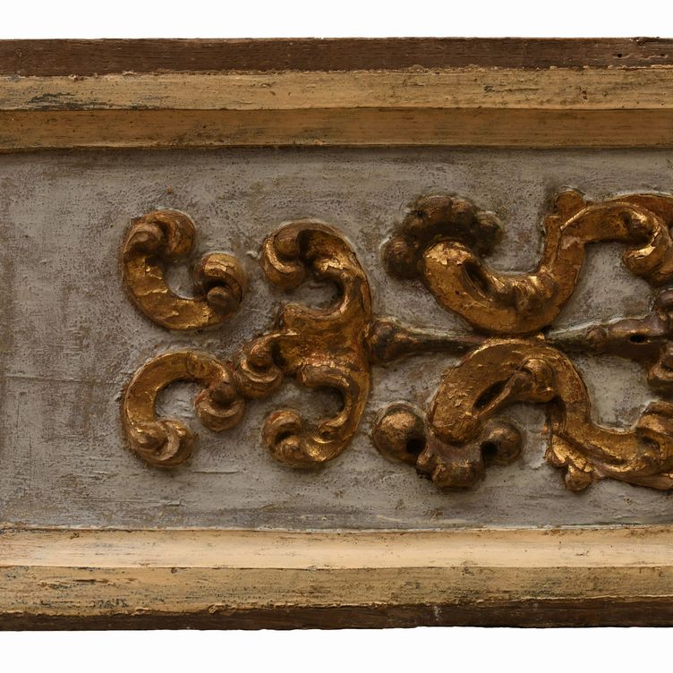 Lotto di due stampi in legno con fregi dorati a rilievo su fondo celeste e 1 stampo a forma di conchiglia policroma