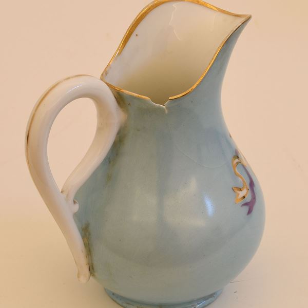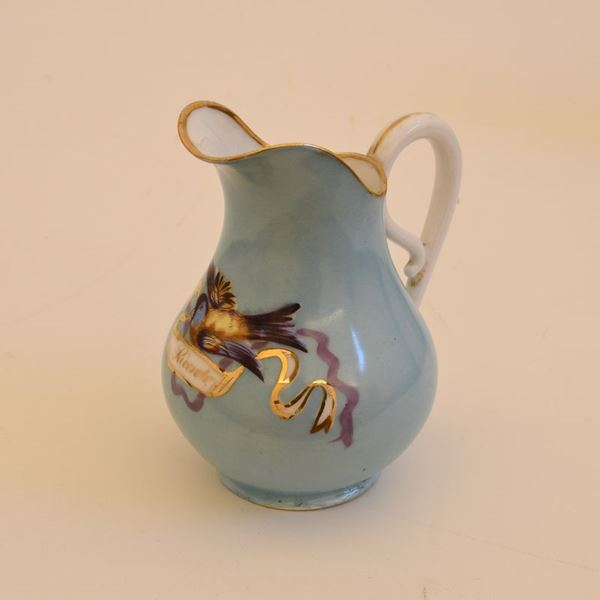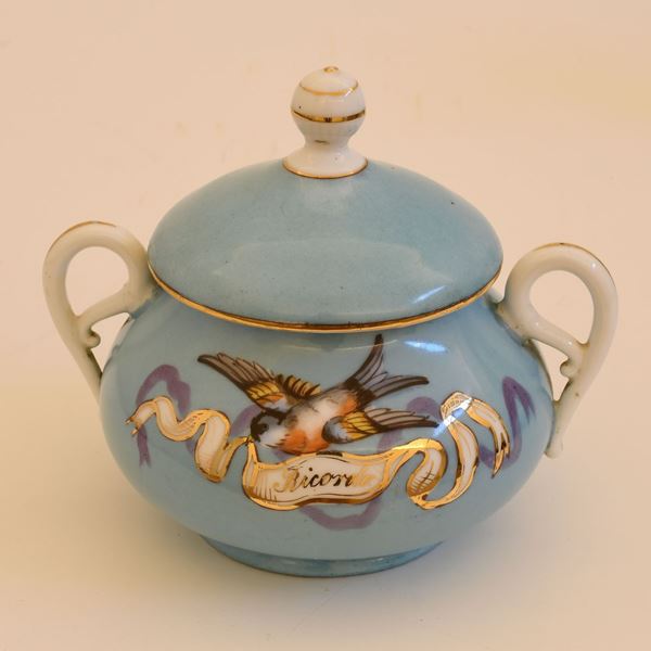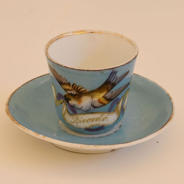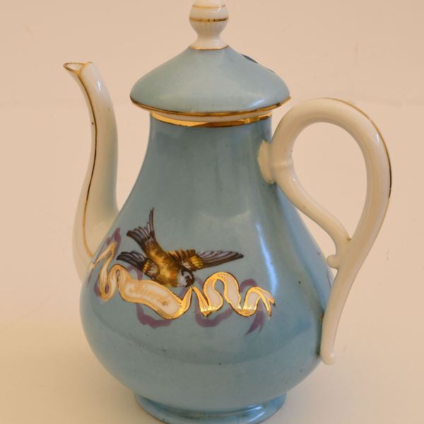 Servizio da caffè in porcellana azzurra e bianca con decoro di cardellino policromo che regge nel becco cartiglio lumeggiato in oro con la scritta [..]