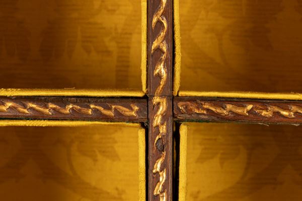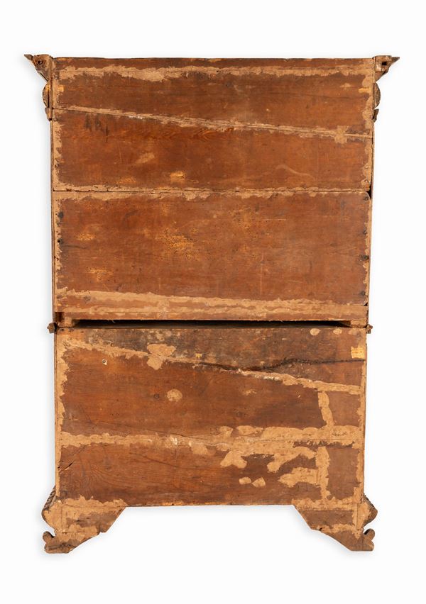 Cappello modanato sorretto da fascia a più ordini di intaglio lumeggiati in oro, l'ultimo dei quali, bombato a tulipano, cela ampio segreto che corre per tutta la larghezza del mobile.