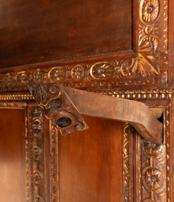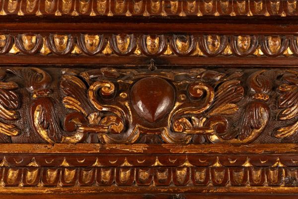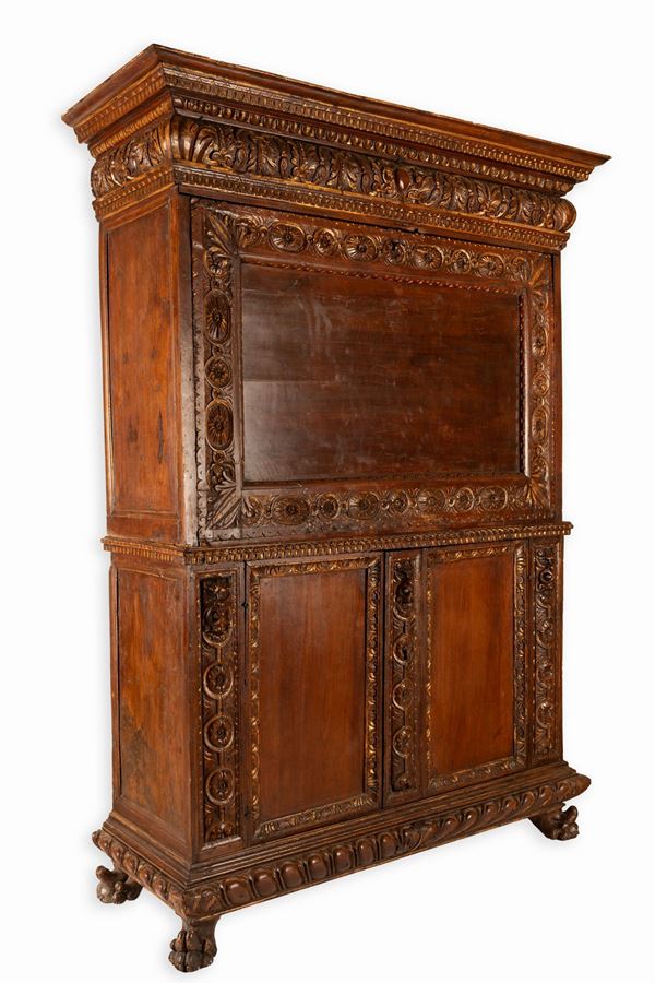 Grande mobile scrittoio in noce con ricco intaglio e lumeggiature in oro. Toscana, seconda metà del XVI secolo