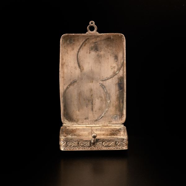 Presenta inciso un ricco decoro fogliato ai lati ed una graziosa incisione a racemi nella parte superiore