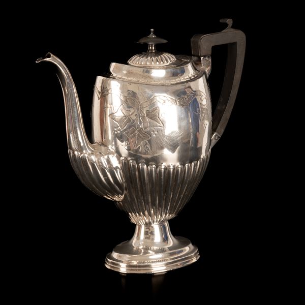 Caffettiera in argento decorata con girali ed edera. Manico e pomello del coperchio in legno di rovere ebanizzato. Punzone Harrison Browers [..]