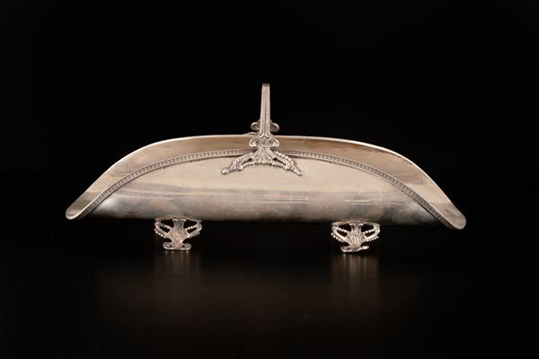 Elegante porta grissini in argento 800/000. Bordo decorato a palmette continue, quattro piedini e manico finemente lavorati.