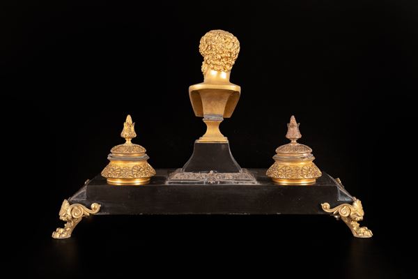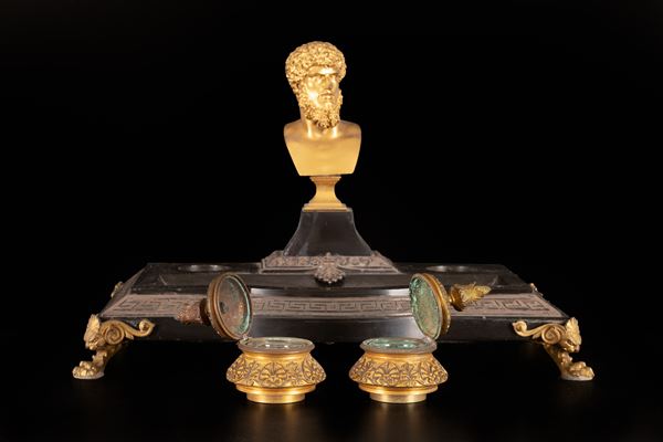Grande calamaio con busto di "Lucius Verus" in bronzo dorato e marmo nero. Piedi ferini. Manifattura francese del XIX secolo