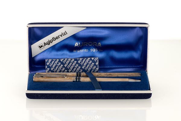 Lotto di due penne, una stilografica e una a sfera Aurora in argento 925/000