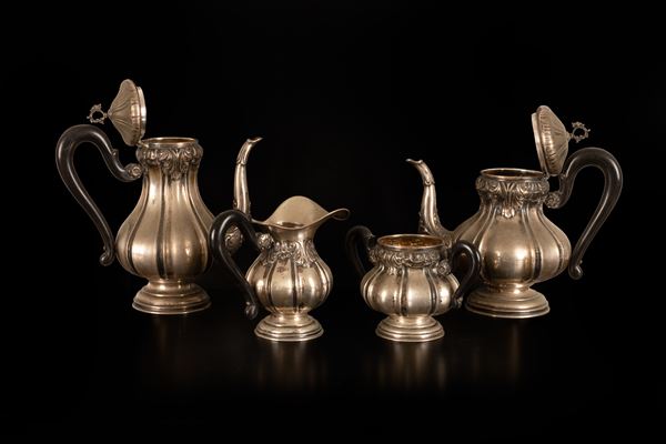 Servizio in argento 800/000 con manici in legno ebanizzato composto da caffettiera, teiera, zuccheriera e lattiera