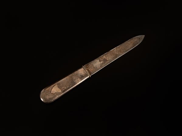 Tagliacarte in argento 800/000 con manico liscio. Punzone 145MI. Firmato Faraone
