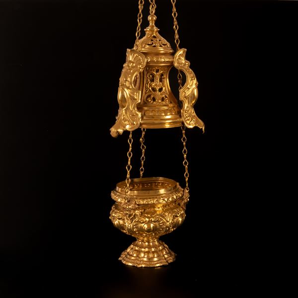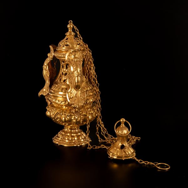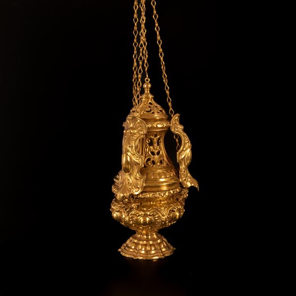 Turibolo incensiere in metallo dorato riccamente cesellato e decorato a rilievo