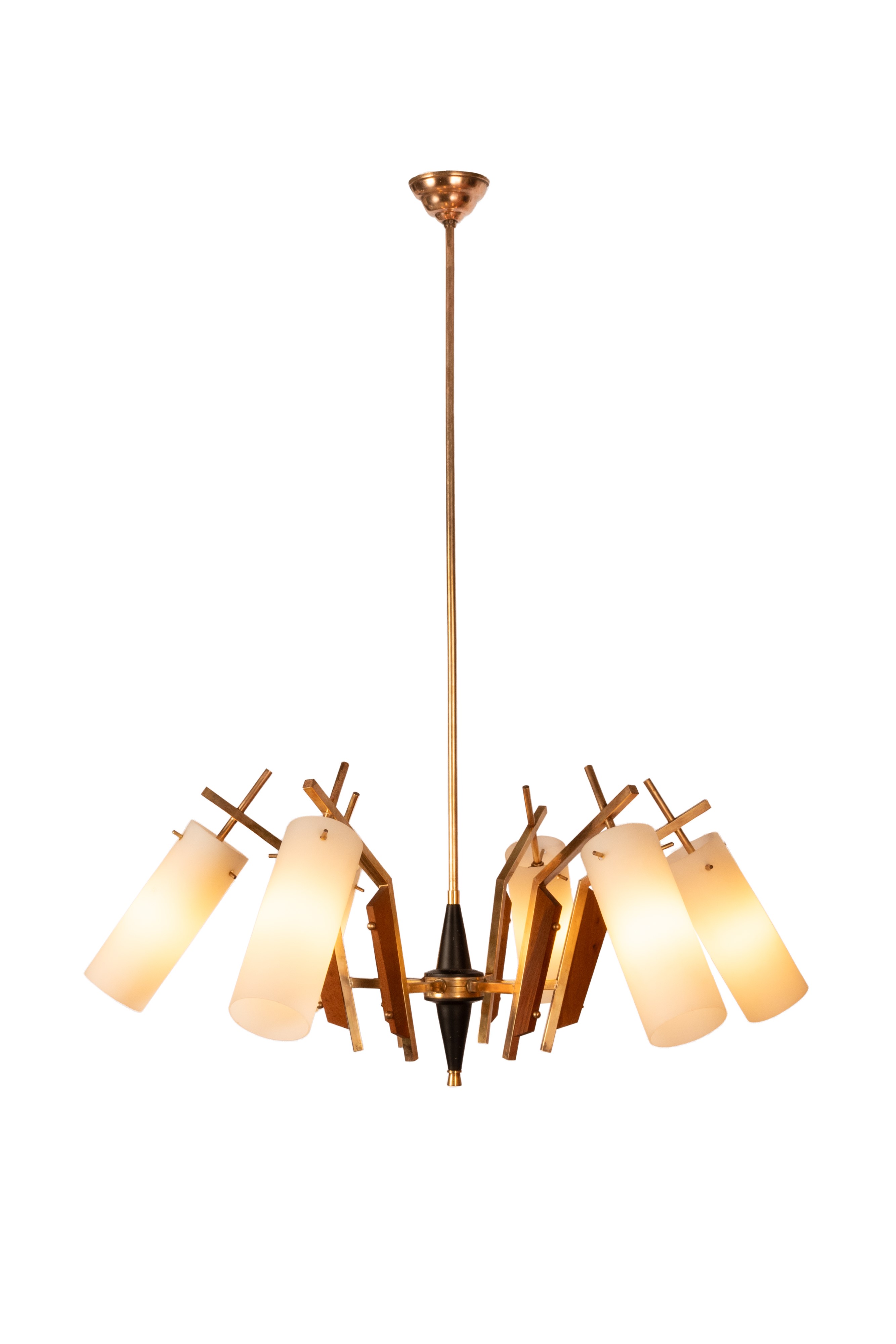 Brass and wood chandelier with cylindrical satin glass diffusers