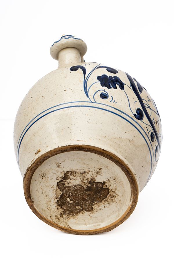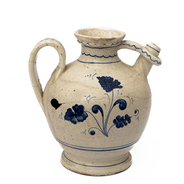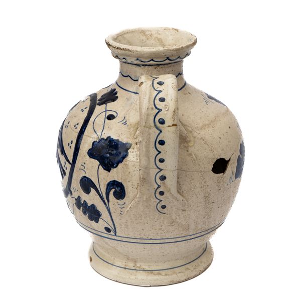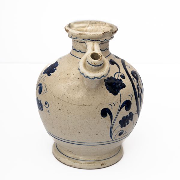 altezza 22 cm, larghezza 20,8 cmL’orciolo ha ansa a nastro e beccuccio-versatore. Dipinto con zaffera a rilievo, appartiene alla “famiglia a foglie di quercia” con, al centro, un uccello con ramoscello d’ulivo. Esecuzione tipica dell’alto-Lazio/ Toscana del sec. XV, è ascrivibile all’ambito del fiorentino Giunta di Tugio (1382-1450), come testimoniano le sue opere e, soprattutto, i reperti della sua fornace, di recente scoperta a Firenze.