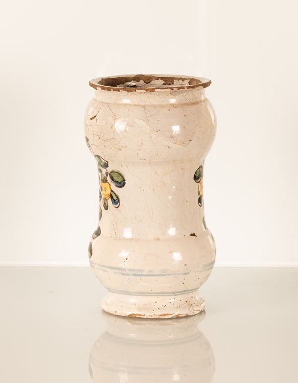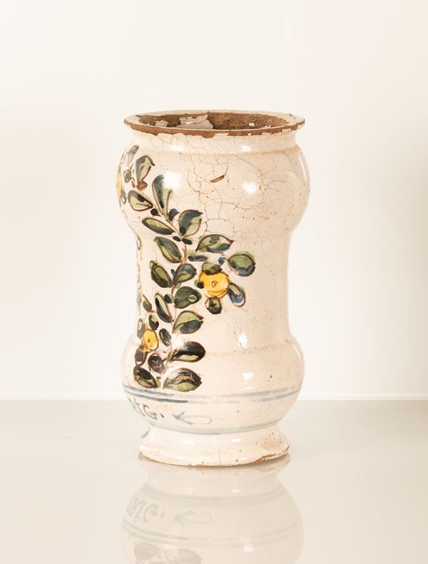 Albarello da farmacia decorato con due serti fioriti stante ad incorniciare un blasone sorretto da due angeli con al centro un'aquila che becca [..]