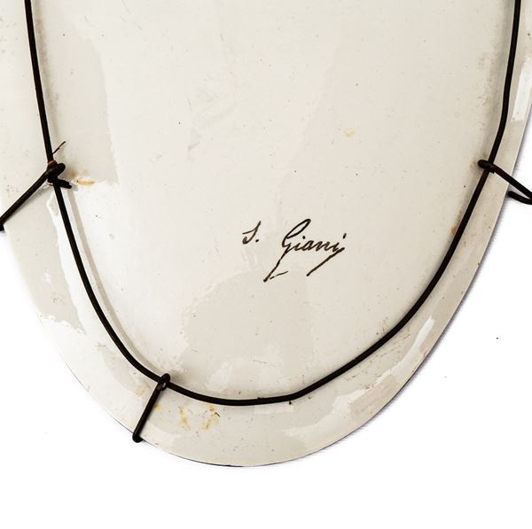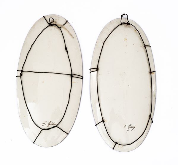 Coppia di fiamminghe decorate con figura di vecchio suonatore di violino e di giovane filatrice inseriti in un paesaggio agreste
