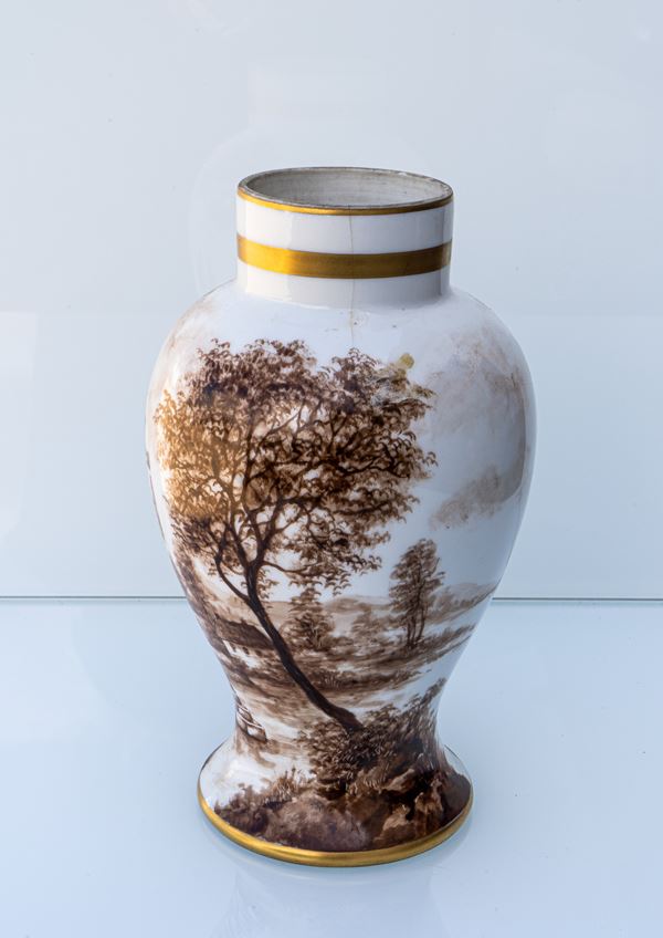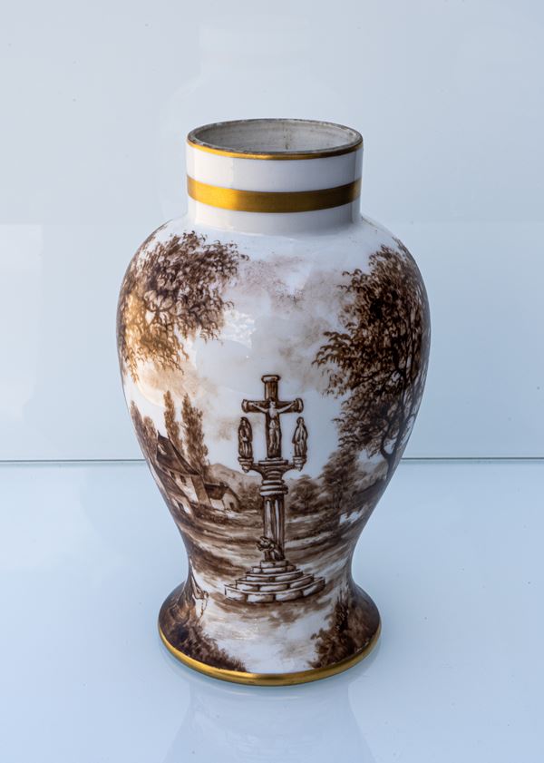 Vaso in porcellana "Vecchia Vienna" con inserti in oro e devoto che prega davanti al crocifisso