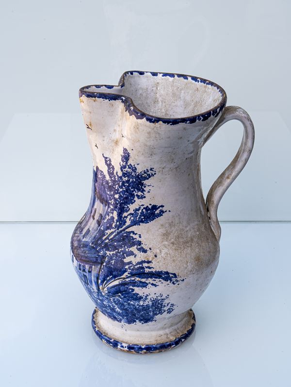 Grande brocca con decori blu e paesaggio.