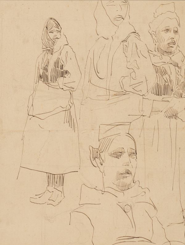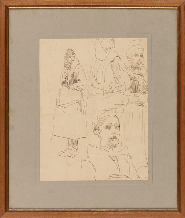Due chine su carta raccolte in elegante passepartout e cornice a più modanature raffiguranti "la confessione del monaco" e "uomo con cappello [..]