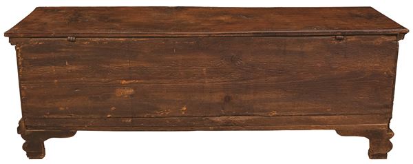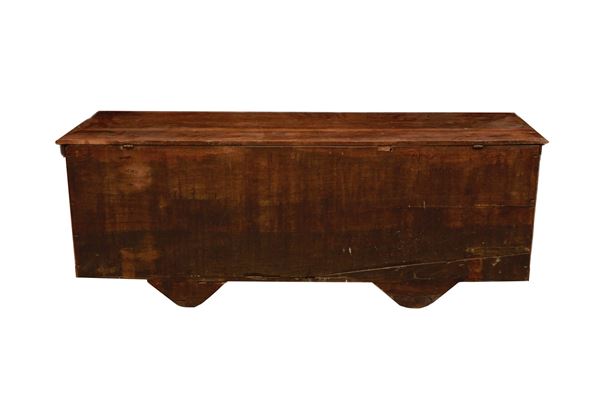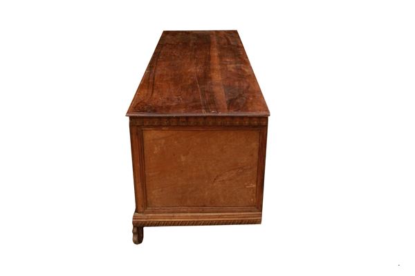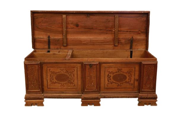 Cassapanca nobiliare in noce scolpita e intarsiata. Veneto, XVII secolo
