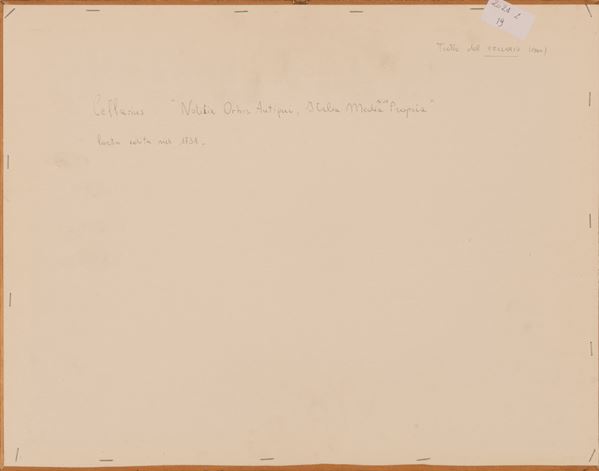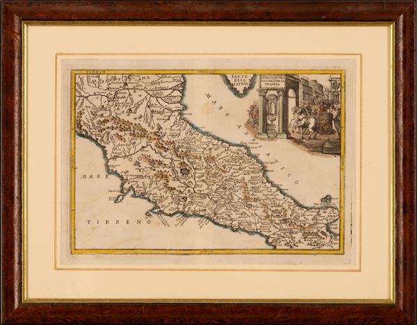Acquaforte acquerellata a manoBella carta, arricchita da cartiglio figurato, raffigurante la penisola fino alla foce del Volturno e al promontorio del Gargano. Tratta dall'opera di Cellarius “NOTITIA ORBIS ANTIQUI SIVE GEOGRAPHIA PLENIOR”, edita da IF Gleditschii a Lipsia nel 1731.