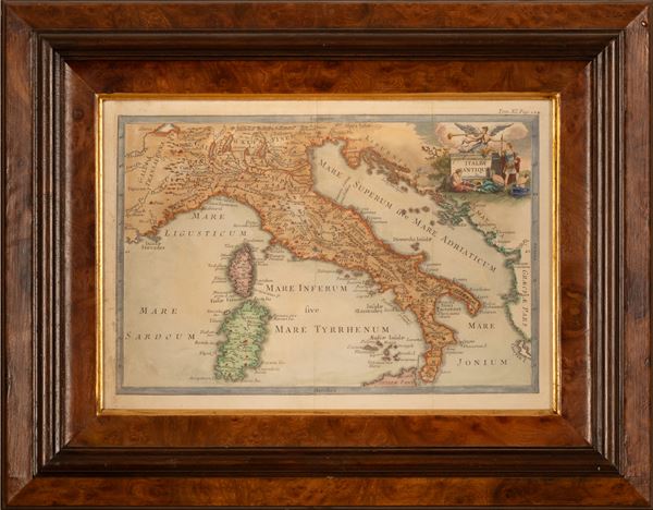 Carta geografica storica dell'Italia, acquerellata a mano, tratta da Notitiae Orbis Antiqui sive Geographiae plenioris di Christophorus Cellarius, celebre erudito vissuto durante la seconda metà del XVII secolo capace di una immensa produzione di studi incentrati sulla storia antica, nell'edizione di Lipsia del 1723 di quella che è una delle principali opere del Cellarius.