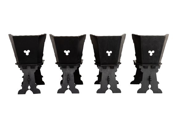 Lotto di 4 scranni in legno di patina nera con gambe, seduta e orlo dello schienale decorate con motivi geometrici. Tirolo, XIX secolo.