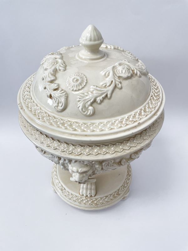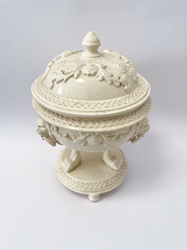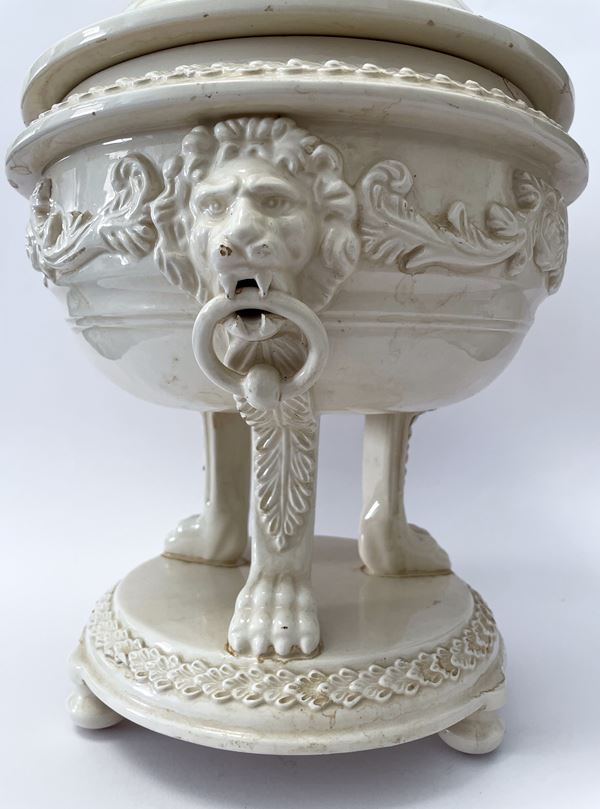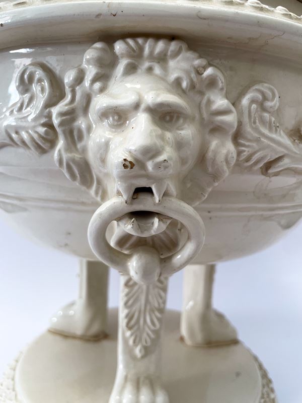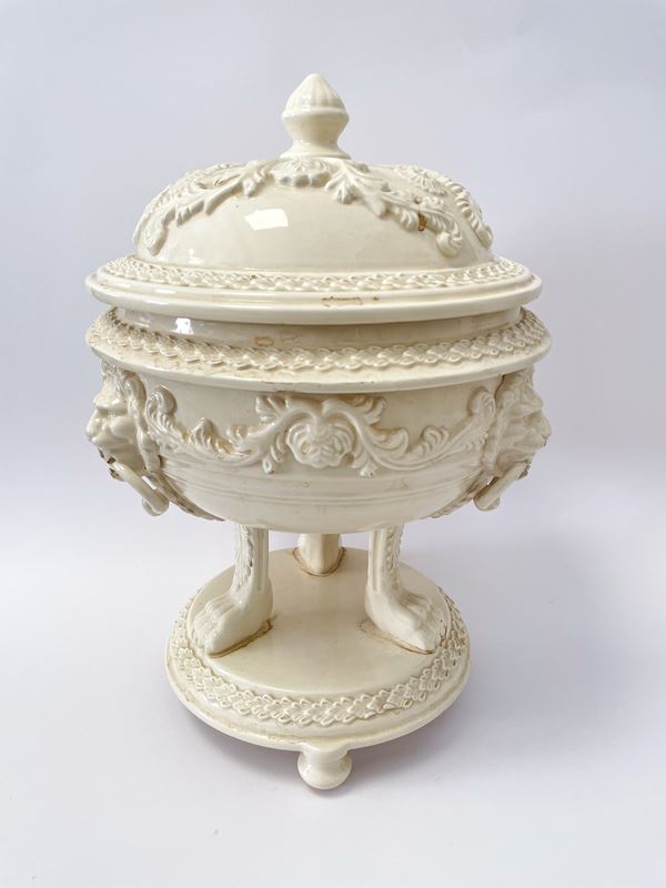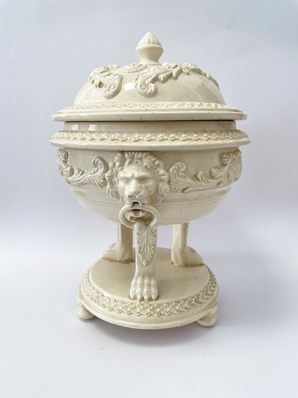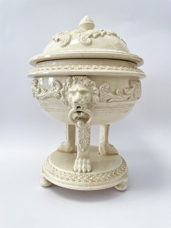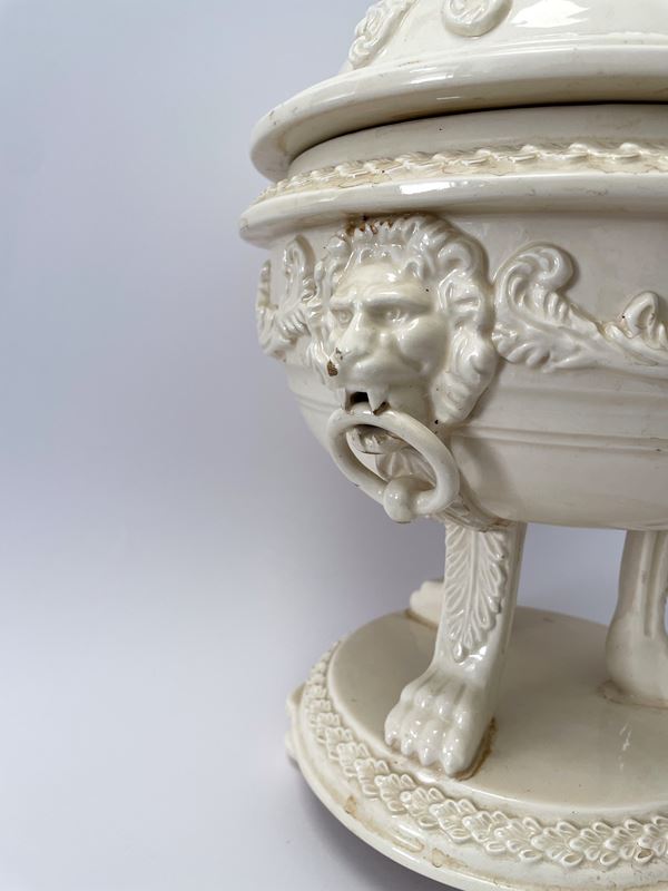 Grande zuppiera in smalto bianco con piedi ferini su disco rialzato da tre piedini sferici.