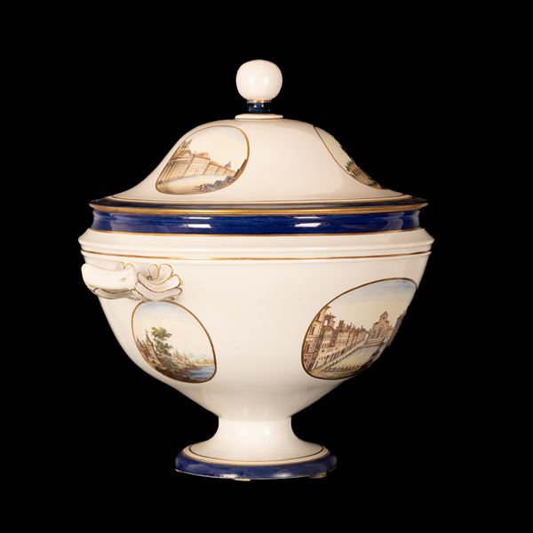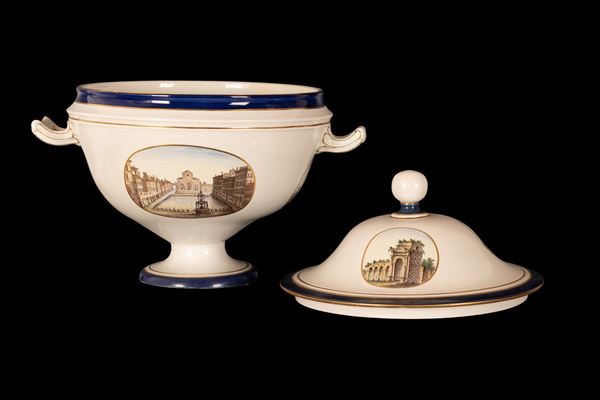 Zuppiera profilata in blu e oro con decori a vedute di città, tre tonde nel coperchio e due ovali nel corpo