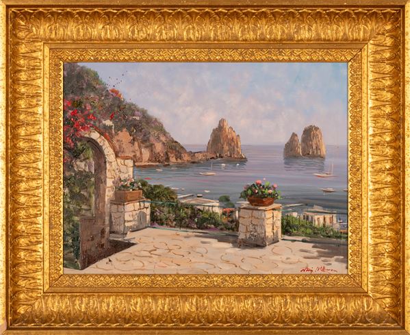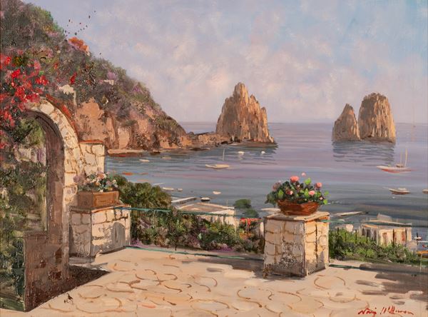 Coppia di oli su tela raffiguranti scorcio di Positano e i Faraglioni di Capri.