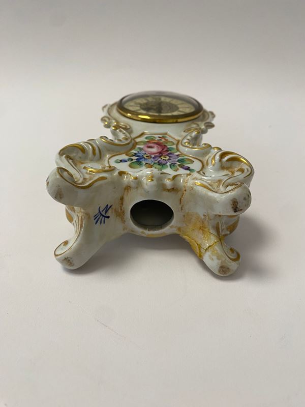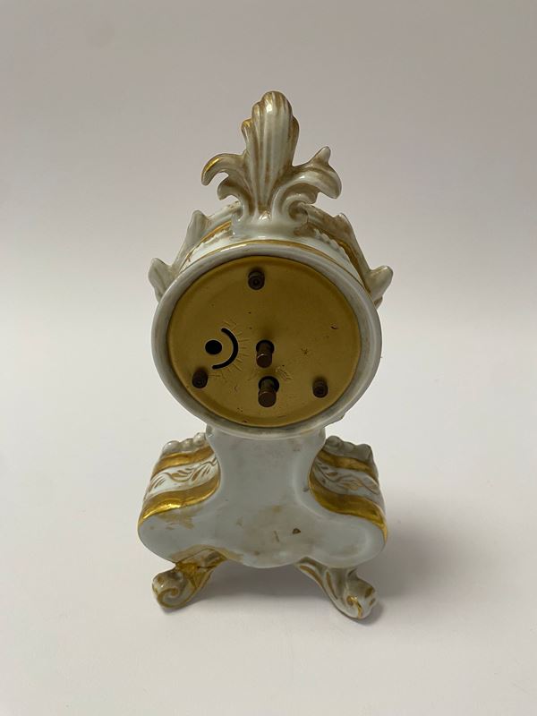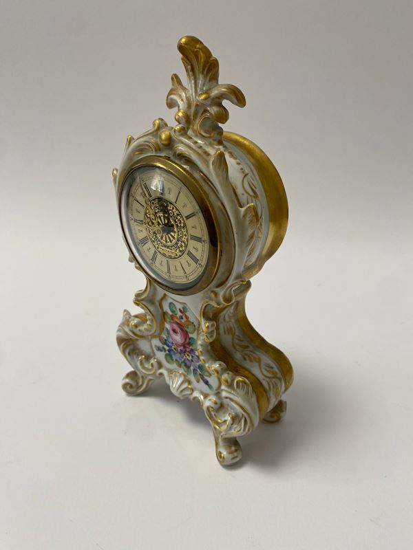 Piccolo orologio da camino in porcellana di Capodimonte con ricche volute e decori floreali