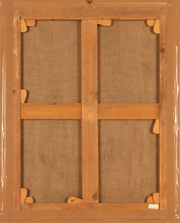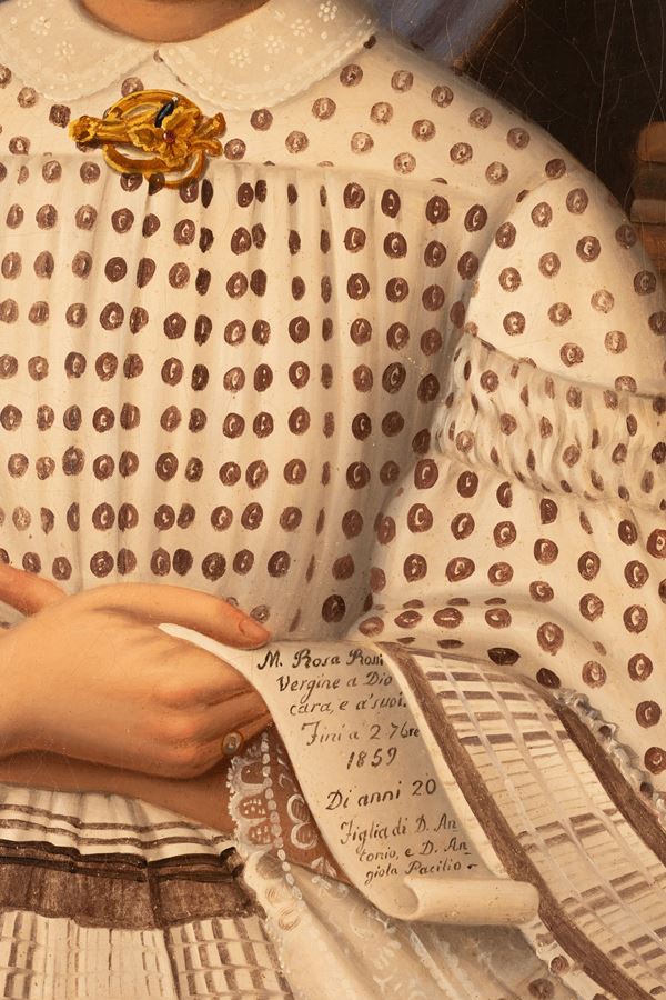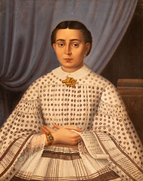cm 81x64,5; con cornici cm 84,5x67,5La ragazza, la cui figura si staglia davanti ad una tenda viola, indossa un sontuoso abito puntinato, arricchito da gioielli. Reca in mano un cartiglio che spiega la sua genealogia ed il giorno della scomparsa nel 1859 a soli 20 anni