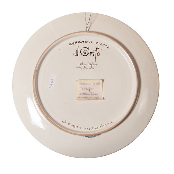 diametro: 45,5 cm.Al retro Ceramica d'Arte  "Il Grifo" di Evelina Pogliani, L'Aquila 1982.