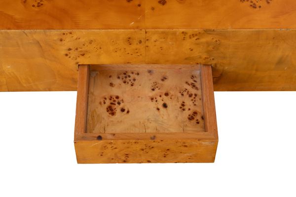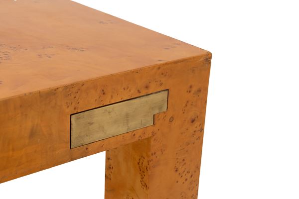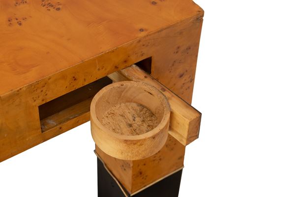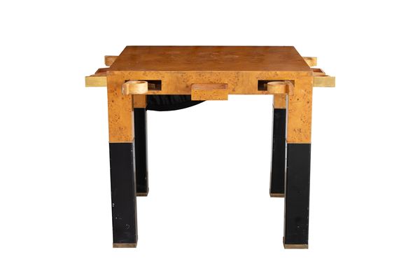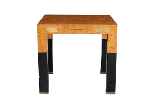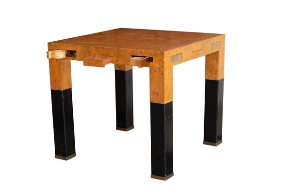 Tavolo da gioco impiallacciato in radica di tuja con cassetti a compasso celanti posaceneri, portabicchieri.