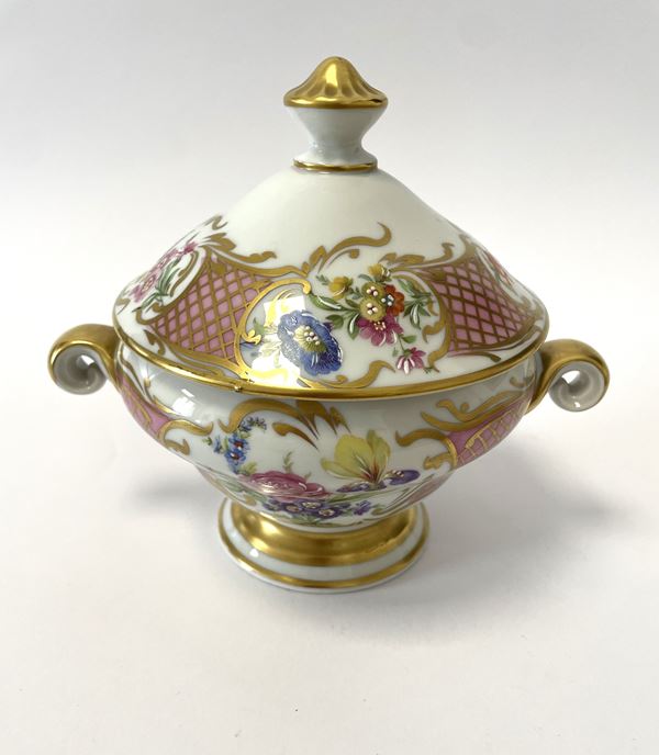 Tazza con coperchio in ceramica Limoges nei toni del rosa con decorazione a motivi floreali