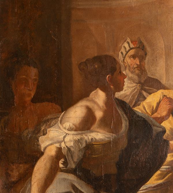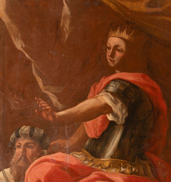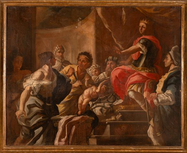 cm 156x196; con cornice cm 174x214l dipinto raffigura l'episodio biblico del Giudizio di re Salomone (I Re, 3, 16-28). Lo stile, le tonalità del colore e la tipologia dei protagonisti, indicano l'origine partenopea del dipinto e lo collocano in un arco di tempo tra il primo e il secondo quarto del XVIII secolo