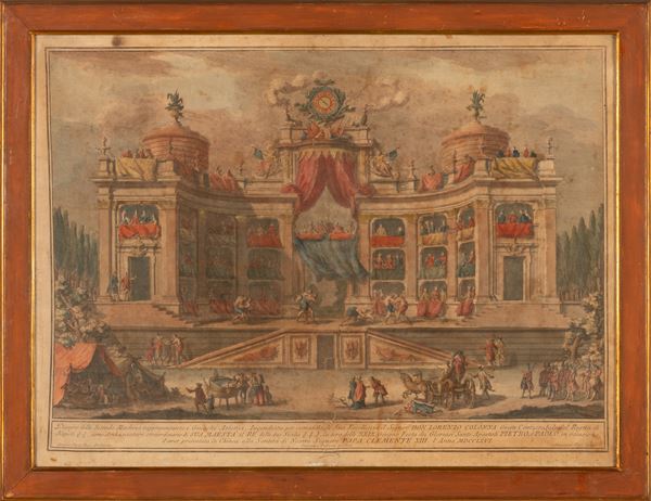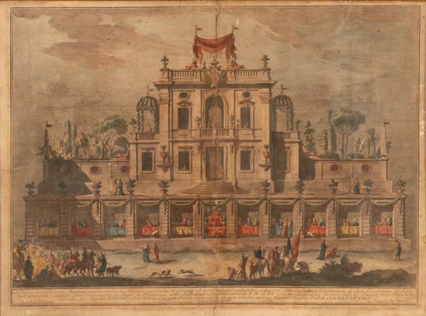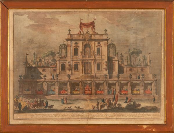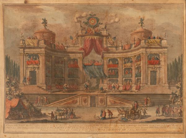 cm 78x52x361) Disegno della Seconda Machina rappresentante un Kiosè, o sia Casino di Delizia all'uso Ottamano imbandito a diporto. Incendiata per comando di Sua Eccellenza il Sig. Don Lorenzo Colonna Gran Contestabile del Regno di Napoli, come Ambasciatore Straodinario di S.M. il Re delle due Sicilie. La sera delli 29 giugno 1762. Festa delli Gloriosi SS Apostoli Pietro e Paolo in occasione di aver presentata la Chinea alla Santità di Nostro signore papa Clemente XIII