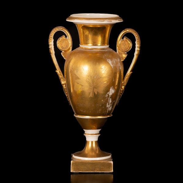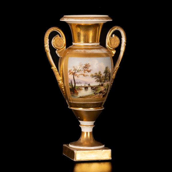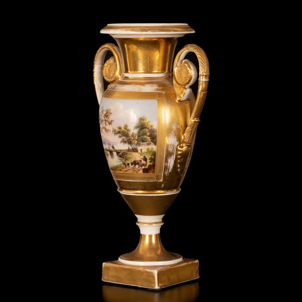 Vaso biansato in porcellana a fondo oro e decoro policromo di paesaggio agreste entro riserva centrale al corpo ovoidale.