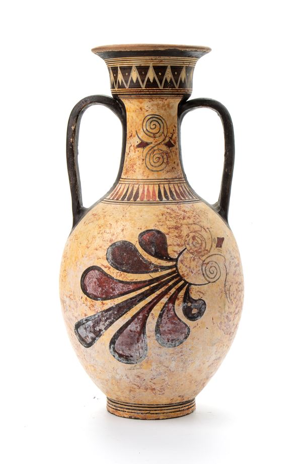Anfora biansata in ceramica arcaica a figure nere con suonatrici di cetra nel corpo e profilo di Saffo sul collo