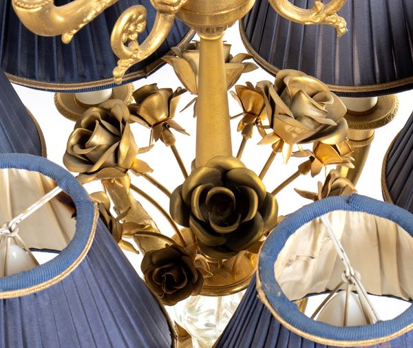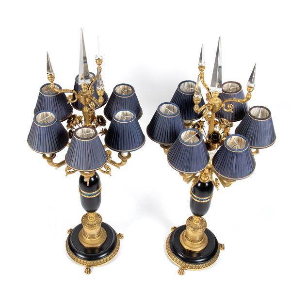 Importante coppia di grandi lampade da tavolo in stile Impero con corpo in ottone dorato e legno ebanizzato.