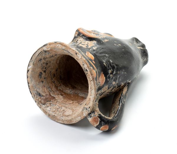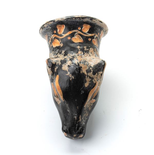 Kantharos zoomorfo in ceramica arcaica nera con decoro a rilievo di tralci fogliati